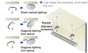 | LED To install the Compact LED Line Light, simply fix the unit to the shelf with screws. Light units can be put to use immediately after purchase. Because they use a household power source (AC100-240V), they can be plugged into a standard electrical outlet. |