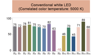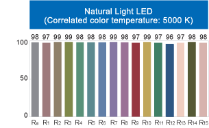 Our original “Natural Light LED,” which precisely reproduces natural sunlight, achieves“Ra98”(Correlated color temperature: 5000 K) out of a maximum 100 on the “average color rendering index,” a standard index of color reproducibility*. This is the highest level ever attained in the industry. This high rendering achieves subtle color expressions that were considered impossible with conventional LED lights.